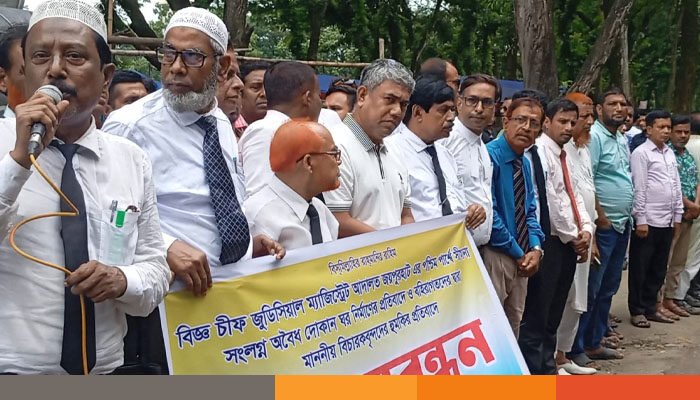 জয়পুরহাট চিফ জুডিসিয়াল ম্যাজিস্ট্রেট আদালতের পশ্চিম পার্শ্বে সীমানা সংলগ্ন অবৈধ দোকান ঘর নির্মাণের প্রতিবাদে ও বহিরাগতদের দ্বারা মাননীয় বিচারকবৃন্দদের হুমকির প্রতিবাদে জয়পুরহাটে মানববন্ধন করেছে বিএনপি পন্থী আইনজীবীরা।