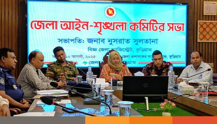 জেলা আইন-শৃঙ্খলা কমিটির সভা কুড়িগ্রামে অনুষ্ঠিত হয়েছে। রোববার সকালে জেলা প্রশাসকের সম্মেলন কক্ষে অনুষ্ঠিত সভায় জেলা প্রশাসক নুসরাত সুলতানার সভাপতিত্বে বক্তব্য রাখেন কুড়িগ্রাম বিজিবির কমান্ডিং অফিসার মাহবুব উল হক, সেনাবাহিনীর কুড়িগ্রাম ক্যাম্প কমান্ডার মেজর আহাদ, জেলা বিএনপির সিনিয়র যুগ্ম আহ্বায়ক অধ্যাপক শফিকুল ইসলাম বেবু, কুড়িগ্রাম জেলা জামায়াতের আমীর নিজাম উদ্দিন, পাবলিক প্রসিকিউটর অ্যাডভোকেট বজলুর রশিদ, সাংবাদিক সাইয়েদ আহমেদ বাবু প্রমুখ।