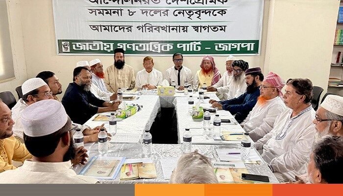 জাগপা সহসভাপতি ও দলীয় মুখপাত্র রাশেদ প্রধানের সভাপতিত্বে অনুষ্ঠিত বৈঠকে বক্তব্য রাখেন- বাংলাদেশ জামায়াতে ইসলামী’র সহকারী সেক্রেটারি জেনারেল হামিদুর রহমান আজাদ, ইসলামী আন্দোলন বাংলাদেশের প্রেসিডিয়াম সদস্য আশরাফ আলী আকন্দ, বাংলাদেশ খেলাফত মজলিসের যুগ্ম-মহাসচিব আতাউল্লাহ আমিন, খেলাফত মজলিসের সিনিয়র নায়েবে আমির সাখাওয়াত হোসাইন ও যুগ্ম-মহাসচিব মোস্তাফিজুর রহমান ফয়সাল, বাংলাদেশ নেজামে ইসলাম পার্টির মহাসচিব মুসা বিন ইজহার চৌধুরী ও সিনিয়র নায়েবে আমির আব্দুল মাজেদ আতাহারী, বাংলাদেশ খেলাফত আন্দোলনের মহাসচিব ইউসুফ সাদেক হাক্কানি ও নায়েবে আমির মুজিবুর রহমান হামিদী, জাগপার সাধারণ সম্পাদক অধ্যাপক ইকবাল হোসেন, বাংলাদেশ ডেভেলপমেন্ট পার্টির স্থায়ী কমিটির সদস্য আবু নাসের নূর নবী জনি এবং অর্থ সম্পাদক রিয়াজ হোসাইন।