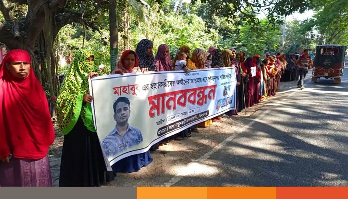 এতে ব্যানার ফেস্টুন নিয়ে নিহতের স্বজন ও এলাকাবাসী অংশ নেয়। মানববন্ধনে নিহতের পিতা সাব্দার বিশ্বাস, ভাই রুবেল হোসেন, স্ত্রী শম্পা খাতুনসহ এলাকাবাসী বক্তব্য রাখেন।