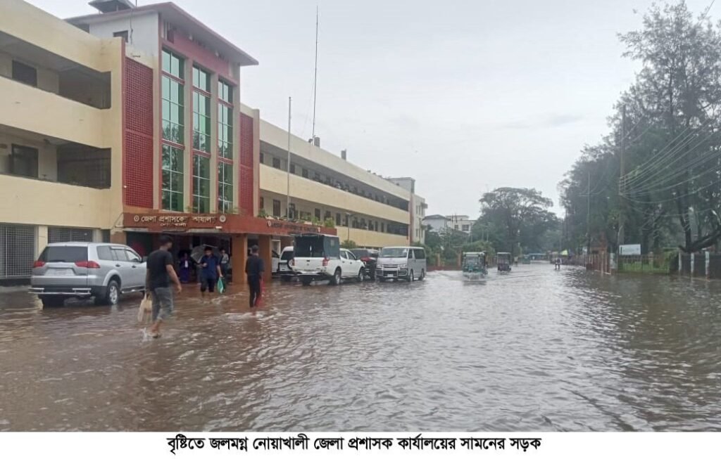 টানা ভারি ভর্ষণে ফের জলমগ্ন হয়ে পড়েছে নোয়াখালী। গত ৩ দিন থেকে থেমে থেমে এবং গতকাল থেকে টানা বৃষ্টিতে পানি জমে শহর ও গ্রামে জলাবদ্ধতার সৃষ্টি হয়েছে। এতে জেলা শহরের বেশিরভাগ রাস্তাঘাট, বাসা-বাড়ি, দোকানপাট ও বিভিন্ন শিক্ষাপ্রতিষ্ঠানের মাঠ-হোষ্টেল পানিতে তলিয়ে গেছে। গ্রামীণ সড়ক ও বাড়িঘরেও ওঠে গেছে পানি। এভাবে বৃষ্টি অব্যাহত থাকলে আগামী দু-এক দিনের মধ্যে জেলায় বন্যার আশঙ্কা করছে স্থানীয়রা।
