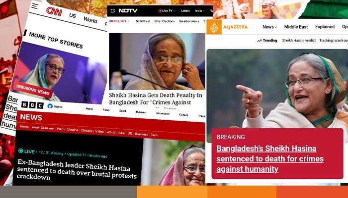 আল জাজিরা শিরোনাম করেছে “মানবতাবিরোধী অপরাধের দায়ে বাংলাদেশে শেখ হাসিনাকে মৃত্যুদণ্ড দেওয়া হয়েছে।” সিএনএন তাদের খবর করেছে “বাংলাদেশের ক্ষমতাচ্যুত নেত্রী শেখ হাসিনার মানবতাবিরোধী অপরাধের দায়ে মৃত্যুদণ্ড।”