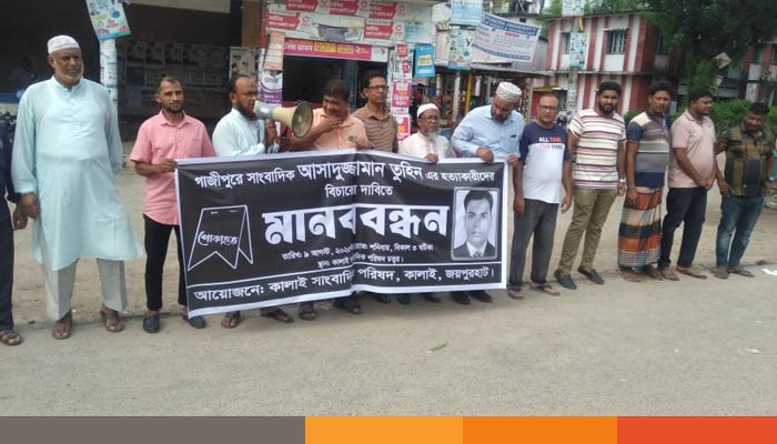এদিকে, গাজীপুরে দৈনিক প্রতিদিন পত্রিকার সাংবাদিক আসাদুজ্জামান তুহিনকে গলা কেটে হত্যা ও দৈনিক বাংলাদেশ আলো পত্রিকার সাংবাদিক আনোয়ার হোসেনকে পুলিশের সামনে সন্ত্রাসী কর্তৃক ইট দিয়ে মাথা থেঁতলিয়ে আহত করার প্রতিবাদ জানিয়ে বিচার দাবিতে মানববন্ধন করেছে কালাই সাংবাদিক পরিষদ।