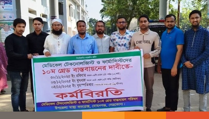 ১০ম গ্রেডের দাবিতে মোহনগঞ্জে মেডিকেল টেকনোলজিস্ট ও ফার্মাসিস্টদের কর্মবিরতি