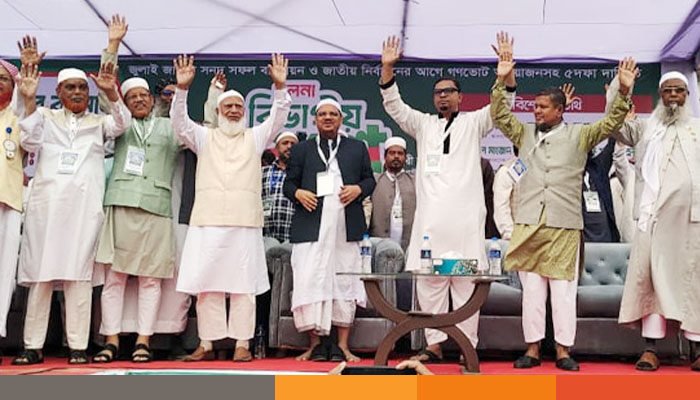 বক্তারা আরও বলেন, আমরা আর প্রতারণার ফাঁদে পড়তে চাই না। আগে গণভোট দিতে হবে, তারপর নির্বাচন। পিআর ব্যবস্থা উচ্চ এবং নিম্ন কক্ষে চালু করতে হবে। সরকারের প্রতি আবেদন, সোজা আঙুলে ঘি না উঠলে আঙুল বাঁকা করতে হবে। ৮ দলের ঐক্য ভাঙতে ষড়যন্ত্র চলছে, কিন্তু আমরা কোনো ষড়যন্ত্রকে এগোতে দেব না। আগামী সংসদে ইসলামী পতাকা উত্তোলনের জন্য যা যা প্রয়োজন, তা আমাদের করতে হবে।