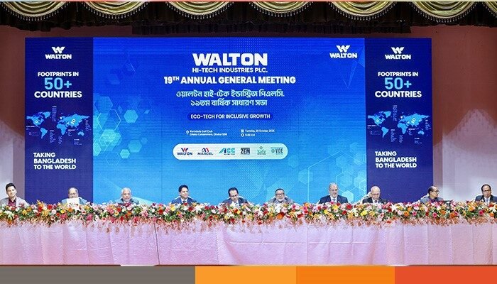 পুঁজিবাজারে তালিকাভুক্ত প্রকৌশল খাতের কোম্পানী, সুপারব্র্যান্ড ও টেক জায়ান্ট ওয়ালটন হাই-টেক ইন্ডাস্ট্রিজ পিএলসি’র ১৯তম বার্ষিক সাধারণ সভা (এজিএম) অত্যন্ত সফলভাবে অনুষ্ঠিত হলো। দেশের রাজনৈতিক অস্থিরতা ও বাণিজ্যিক প্রতিকূলতার মধ্যেও ১৭৫ শতাংশ ক্যাশ ডিভিডেন্ড দেয়ায় সভায় সন্তুষ্টি প্রকাশ করে ওয়ালটনের পরিচালনা পর্ষদকে ধন্যবাদ জানান সাধারণ বিনিয়োগকারীরা। তাঁরা দেশে উদ্ভাবনী ও সর্বাধুনিক প্রযুক্তির লিথিয়াম আয়ন ব্যাটারি উৎপাদন কারখানা স্থাপনে ওয়ালটনের বিনিয়োগের ঘোষণায় উচ্ছ্বাস প্রকাশ করেন। অচিরেই ১’শরও বেশি দেশে ওয়ালটনের বৈশ্বিক বাজার সম্প্রসারিত হবে বলে আশাবাদ ব্যক্ত করেন বিনিয়োগকারীরা।