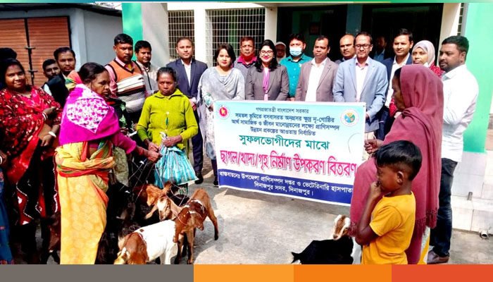 দিনাজপুর উপজেলা প্রাণিসম্পদ কার্যালয়ে উপজেলা প্রাণিসম্পদ দপ্তর ও ভেটেরিনারী হাসপাতালের আয়োজনে, সমতল ভূমিতে বসবাসরত অনগ্রসর ক্ষুদ্র নৃ-গোষ্ঠীর মধ্যে প্রাণিসম্পদ উন্নয়ন প্রকল্পের আওতায় নির্বাচিত সুফল ভোগীদের মাঝে বিনামূল্যে ছাগল ও গৃহ নির্মাণ উপকরণ বিতরণ করা হয়েছে।