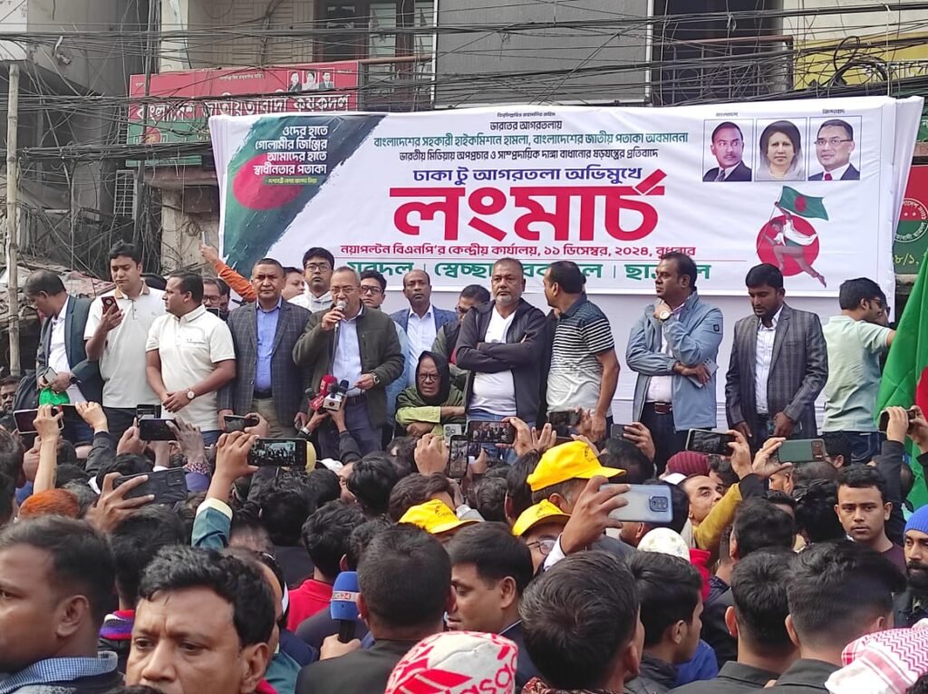 ভারতীয় আগ্রাসনের প্রতিবাদে আগরতলা অভিমুখে লং মার্চ করছে বিএনপির তিন সংগঠন। সকাল ৯টার দিকে নয়াপল্টন থেকে এই কর্মসূচী শুরু হয়।