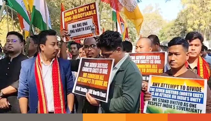 ভারতের ‘সেভেন সিস্টার্স’ বিচ্ছিন্ন করে দেওয়ার হুমকির প্রতিবাদে আগরতলায় বাংলাদেশ সহকারী হাইকমিশনারের দপ্তরের সামনে বিক্ষোভ করেছে টিপরা মোথা পার্টির যুব শাখা ইয়ুথ টিপরা ফেডারেশন (ওয়াইটিএফ)। গতকাল শুক্রবার সংগঠনটির কয়েকশ সদস্য হাইকমিশনের কিছু দূরে জড়ো হয়ে মিছিল করতে গিয়ে পুলিশি বাধার মুখে পড়েন। পরিস্থিতি নিয়ন্ত্রণে ওই কার্যালয়ের ২০০ মিটার আগেই ব্যারিকেড দেয় পুলিশ। সেখানেই বিক্ষোভ করেন সংগঠনটির নেতাকর্মীরা।