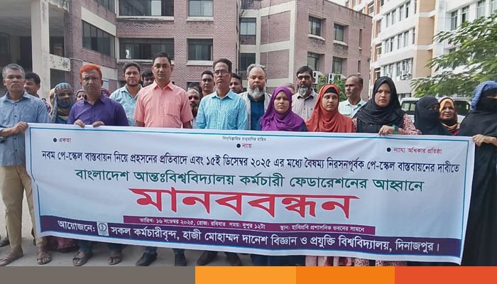 দিনাজপুরে নবম পে–স্কেল বাস্তবায়নে দীর্ঘদিনের বৈষম্যের প্রতিবাদে দেশজুড়ে একযোগে মানববন্ধন করেছে বাংলাদেশ আন্তঃবিশ্ববিদ্যালয় কর্মচারী ফেডারেশন। সংগঠনের আহ্বানে আজ রবিবার দুপুর ১২টায় দেশের সব পাবলিক বিশ্ববিদ্যালয়ে একযোগে এ কর্মসূচি পালন করা হয়।