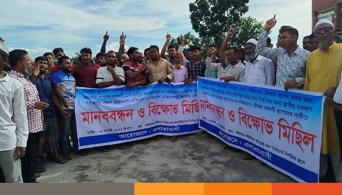 মঙ্গলবার‌(১৯ আগস্ট) বিকালে উপজেলার সহিলদেও গ্রামে মদন-মোহনগঞ্জ পাকা রাস্তার ওপর এ মানববন্ধন ও বিক্ষোভ অনুষ্ঠিত হয়। এতে কয়েকটি গ্রামের সহস্রাধিক মানুষ অংশ নেয়।