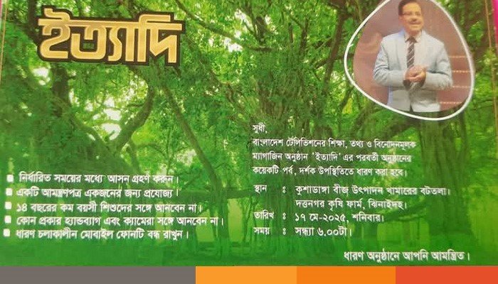 বাংলাদেশ টেলিভিশনের শিক্ষা-তথ্য ও বিনোদনমূলক ম্যাগাজিন অনুষ্ঠান ইত্যাদি’র এবারের পর্ব ধারণ করা হচ্ছে ঝিনাইদহে। রং-বেরঙে সাজানো হয়েছে মহেশপুর উপজেলার দত্তনগর কৃষি ফার্মের কুশাডাঙ্গা বটতলা প্রাঙ্গন। শনিবার (১৭ মে) সন্ধ্যা ৬টা থেকে রাত ৯টা পর্যন্ত এ আয়োজন অনুষ্ঠিত হবে। উপস্থাপক হানিফ সংকেতের প্রাণবন্ত উপস্থাপনায় জমে উঠবে পুরো আয়োজন। গ্রামীণ সৌন্দর্য, ইতিহাস আর সংস্কৃতির ছোঁয়া নিয়ে এবার ইত্যাদি হাজির হচ্ছে সীমান্ত জনপদে।