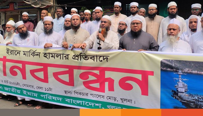 জাতীয় ইমাম পরিষদ খুলনা মহানগর শাখার জয়েন্ট সেক্রেটারি মুফতী জুনাইদ আহমাদের সঞ্চালনায় মানববন্ধনে বক্তারা বলেন, ইরানের উপর মার্কিন ও ইসরাইলি হামলা আন্তর্জাতিক আইন ও মানবাধিকারের পরিপন্থী। তারা এ হামলার তীব্র নিন্দা ও প্রতিবাদ জানান এবং বিশ্ব মুসলিম উম্মাহকে ঐক্যবদ্ধ হয়ে অন্যায়ের বিরুদ্ধে সোচ্চার হওয়ার আহ্বান জানান।