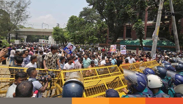 ঢাকা দক্ষিণ সিটি কর্পোরেশনের (ডিএসসি) মেয়র হিসেবে ইশরাক হোসেনকে দায়িত্ব দেওয়ার দাবিতে সচিবালয় অভিমুখে লংমার্চ কর্মসূচিতে বাধা দিয়েছে পুলিশ। ব্যারিকেডের কারণে সচিবালয়ের দিকে যেতে পারেননি ইশরাক সমর্থকরা।