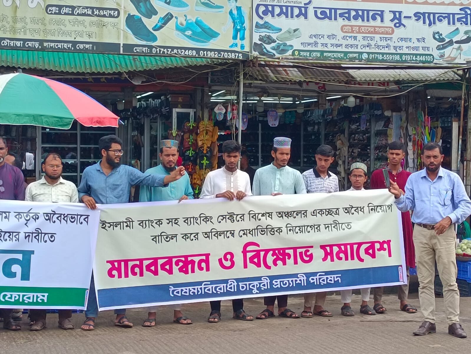 ইসলামী ব্যাংকসহ দেশের ব্যাংকিং সেক্টরে বিশেষ অঞ্চলে একচেটিয়া অবৈধ নিয়োগ বাতিল ও মেধাভিত্তিক নিয়োগের দাবিতে ভোলার লালমোহনে মানববন্ধন ও বিক্ষোভ সমাবেশ অনুষ্ঠিত হয়েছে।