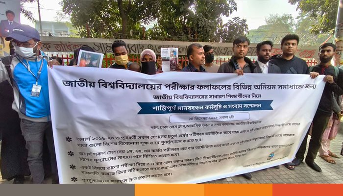 এক ও দুই বিষয়ে অকৃতকার্য শিক্ষার্থীদের ক্ষেত্রে মানবিক বিবেচনায় পুনর্মূল্যায়ন, বিশেষ মূল্যায়ন এবং গ্রাজুয়েশন সম্পন্নের সুযোগ দেওয়ার দাবি জানিয়েছে জাতীয় বিশ্ববিদ্যালয়ের ২০১৯–২০ সেশনসহ আগের সেশনগুলোর শিক্ষার্থীরা। ইতোমধ্যে এ দাবিতে জাতীয় বিশ্ববিদ্যালয়ের ভাইস–চ্যান্সেলরের কাছে একটি স্মারকলিপি দিয়েছেন সাধারণ শিক্ষার্থীরা।বুধবার (২৪ ডিসেম্বর) জাতীয় প্রেস ক্লাবের সামনে আয়োজিত এক মানববন্ধন থেকে এ দাবি জানান শিক্ষার্থীরা।