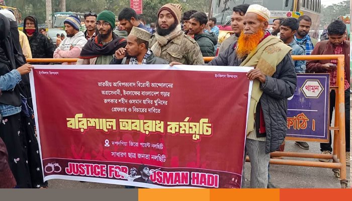 রবিবার বিকাল ৩ টায় বরিশাল কুয়াকাটা মহাসড়কের দপদপিয়া জিরো পয়েন্ট এলাকায় বিক্ষোভ শুরু করে ছাত্র জনতা।এ সময় তারা বিভিন্ন স্লোগান দিয়ে মহাসড়কে বেড়িকেট দিয়ে যানবাহনের গতিরোধ করে ছাত্রজনতা। মুহূর্তেই মহাসড়কে যান চলাচল সম্পূর্ণ বন্ধ করে দেয়।ঘন্টাব্যাপী অবরোধের কারণে বরিশাল ও ঢাকাগামী রুটের দূরপাল্লার বাসসহ বিভিন্ন পরিবহনের শতাধিক যানবাহন আটকা পড়ে এবং ভোগান্তিতে পড়েন যাত্রীরা। এসময় বিক্ষোভকারীদের মধ্যে বক্তব্য রাখেন আহত জুলাই যোদ্ধা মিন্টু হাওলাদার,শিক্ষার্থী সাথি আক্তার,সমাজকর্মী বালী তাইফুর রহমান তুর্যসহ অনেকে। অবরোধকারীরা জানান, হাদি হত্যার এতদিন পর অন্তবর্তীকালীন সরকার খুনি ভারতে পালিয়ে যাবার তথ্য জানানো হল। এটি নি:সন্দেহ পুলিশসহ অন্যানো আইনশৃঙ্খলা বাহিনীর দায়সাড়া ভুমিকা এবং উদ্দেশ্যে প্রনোদিত। শরিফ ওসমান হাদির হত্যাকারীদের আগামী দ্রুততম সময়ের মধ্যে গ্রেপ্তার করতে না পারলে তারা আরও কঠোর কর্মসূচি ঘোষণা করবে বলে তারা হুশিয়ারি দেন।