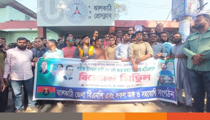 ইনকিলাব মঞ্চের মুখপাত্র ও ঢাকা-৮ আসনে সতন্ত্র সংসদ সদস্য প্রার্থী শরীফ ওসমান হাদি ঢাকায় গুলিবিদ্ধ হওয়ার ঘটনার প্রতিবাদে ঝালকাঠিতে বিক্ষোভ ও সমাবেশ করেছে জেলা বিএনপি ও অঙ্গ ও সহযোগী সংগঠন।
