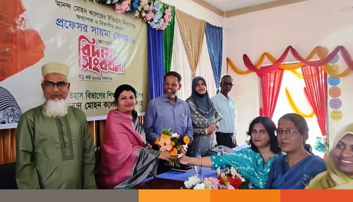ময়মনসিংহের ঐতিহ্যবাহী আনন্দ মোহন কলেজের ইতিহাস বিভাগের অধ্যাপক ও বিভাগীয় প্রধান প্রফেসর সায়মা বেগমের অবসরজনিত বিদায় সংবর্ধনা অনুষ্ঠিত হয়েছে।