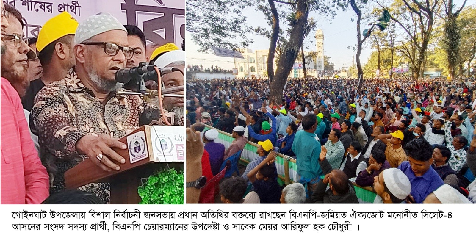 কেন্দ্রীয় শহীদ মিনার প্রাঙ্গনে আয়োজিত নির্বাচনি জনসভায় গোয়াইনঘাট উপজেলা বিএনপির সভাপতি মাহবুব আলম এর সভাপতিত্বে ও সাধারণ সম্পাদক মো: জসিম উদ্দিনের পরিচালনায় বিশেষ অতিথির বক্তব্য রাখেন, বিএনপি চেয়ারম্যানের উপদেষ্টা ড.এনাম আহমদ চৌধুরী, গোয়াইনঘাট উপজেলা পরিষদের সাবেক চেয়ারম্যান আব্দুল হাকিম চৌধুরী, সিলেট মহানগর বিএনপির সাবেক সাধারণ সম্পাদক বদরুজ্জামান সেলিম, জমিয়তে উলামায়ে ইসলাম বাংলাদেশ, সিলেট জেলার সভাপতি হযরত মাওলানা আতাউর রহমান, জমিয়তে উলামায়ে ইসলাম বাংলাদেশ, কেন্দ্রীয় আইন বিষয়ক সম্পাদক এডভোকেট মোহাম্মদ আলী, গোয়াইনঘাট উপজেলা বিএনপির সাবেক সভাপতি উসমান গনি, সিলেট জেলা বিএনপির উপদেষ্ঠা লুৎফুল হক খোকন, আব্দুশ শুকুর, হেলাল উদ্দিন আহমদ, সিলেট জেলা বিএনপির যুগ্ম সাধারণ সম্পাদক ইশতিয়াক আহমদ সিদ্দিকী, রবিউল ইসলাম শাহপরান, সাংগঠনিক সম্পাদক শামীম আহমদ, ক্রীড়া ও সংস্কৃতি সম্পাদক স্টেলিং তারিয়াং,সিলেট মহানগর বিএনপির সাবেক ভারপ্রাপ্ত সাধারণ সম্পাদক আজমল বখত সাদেক, সিলেট জেলা শ্রমিকদলের সভাপতি হাজী সুরমান আলী, হগোয়াইনঘাট উপজেলা পরিষদের সাবেক চেয়ারম্যান শাহ আলম স্বপন।