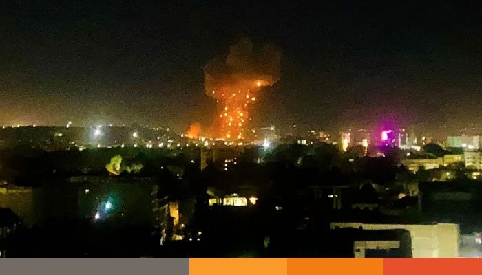 স্থানীয় টেলিভিশন চ্যানেলগুলোতে প্রচারিত ভিডিওতে দেখা গেছে, ধ্বংসস্তূপের মধ্যে আগুন নেভাতে হিমশিম খাচ্ছেন দমকলকর্মীরা।