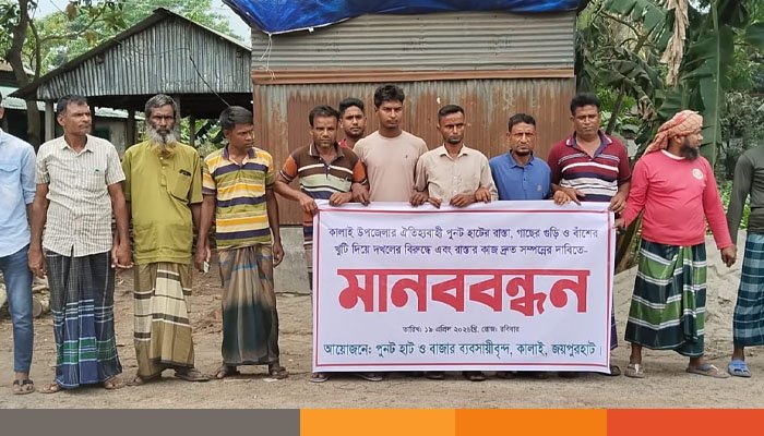 মানববন্ধনে স্থানীয় ব্যবসায়ী নুর মোহাম্মদ, জিয়াদুল ইসলাম, লেবার সর্দার রানাসহ অন্যরা বক্তব্য দেন। এ সময় বক্তারা বলেন, দীর্ঘদিন ধরে সড়কের পাশে গাছের গুঁড়ি ও বাঁশের খুঁটি ফেলে রেখে অবৈধভাবে রাস্তা দখল করে রাখা হয়েছে। এতে ওই সড়কে যান চলাচল মারাত্মকভাবে ব্যাহত হচ্ছে। ফলে হাটে আসা সাধারণ মানুষ ও ব্যবসায়ীরা চরম ভোগান্তির শিকার হচ্ছেন।