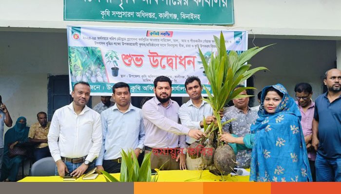 ২০২৪-২৫ অর্থবছরের প্রণোদনা কর্মসূচির আওতায় নারিকেলের উৎপাদন বৃদ্ধির লক্ষ্যে ঝিনাইদহের কালীগঞ্জে নারিকেল চারা বিতরণ কার্যক্রমের শুভ উদ্বোধন অনুষ্ঠিত হয়েছে। বৃহঃবার (২৬ জুন) সকালে উপজেলা কৃষি অফিস চত্বরে এ বিতরণ কর্মসূচির উদ্বোধন করেন উপজেলা সহকারি কমিশনার(ভূমি) শাহিন আলম।