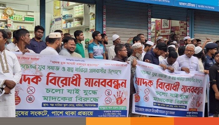 চলো যাই যুদ্ধে, মাদকের বিরুদ্ধে, আমার সোনার বাংলায়, মাদক ব্যবসায়ী ট্রাই নাই, এই স্লোগানকে সামনে রেখে।কিশোরগঞ্জ সদর উপজেলার ৮ নং মারিয়া ইউনিয়নের স্বল্প মারিয়া সচেতন যুব সমাজ ও এলাকাবাসীর উদ্যোগে মাদক বিরোধী মানববন্ধন অনুষ্ঠিত হয়েছে।