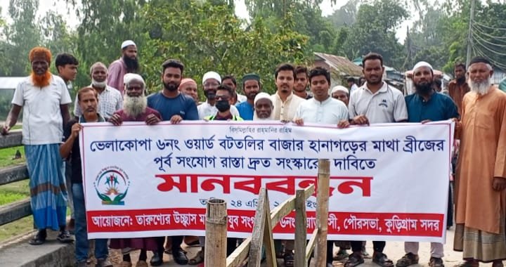 কুড়িগ্রাম পৌরসভার টাপু ভেলাকোপা সড়কের ভেঙে পড়া সেতুর সংযোগ সড়ক সংস্কারের দাবিতে মানববন্ধন করেছে এলাকাবাসী। দীর্ঘ ৯ বছরেও কোনো কার্যকর উদ্যোগ না নেওয়ায় ক্ষোভ ও হতাশা প্রকাশ করেছেন স্থানীয়রা।