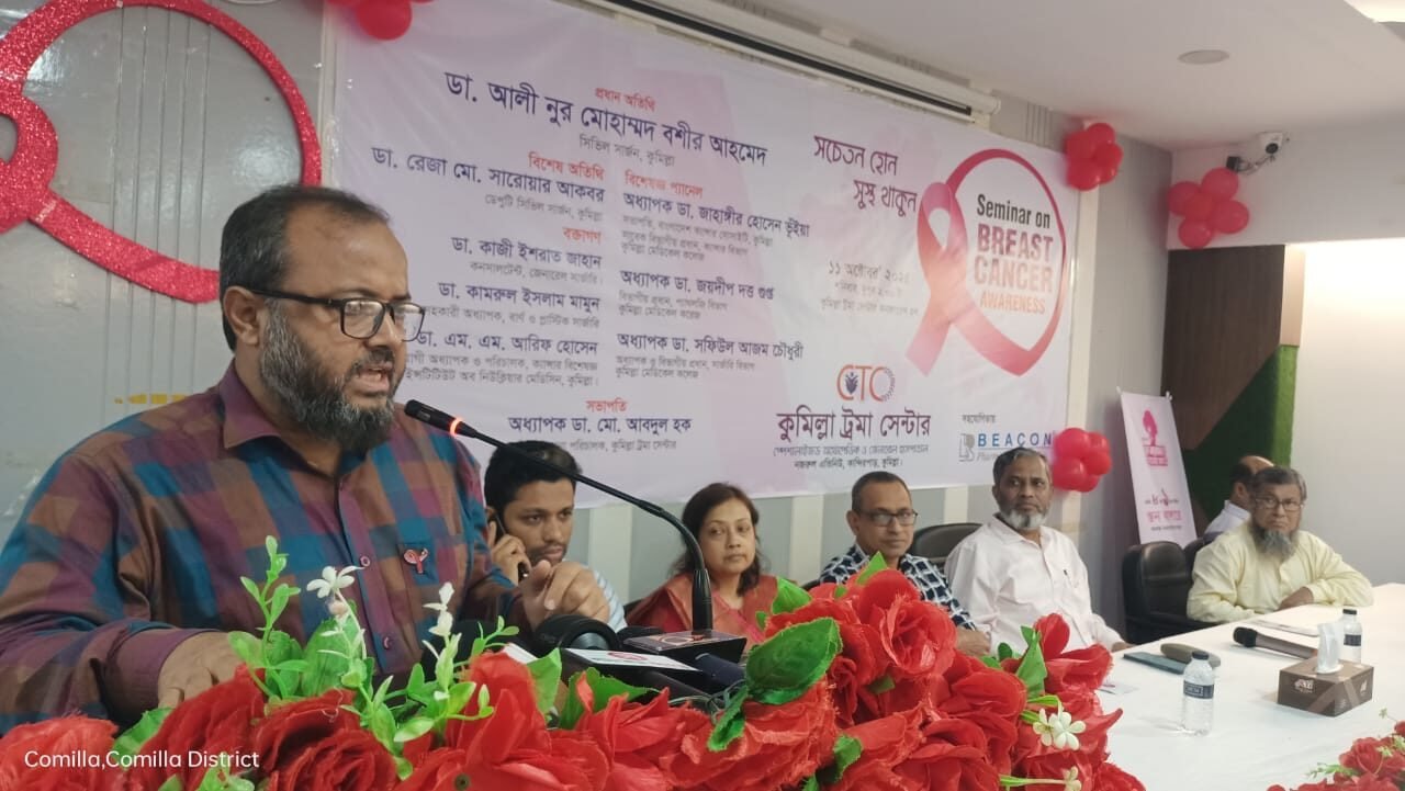 আজ শনিবার (১১ অক্টোবর) দুপুরে কুমিল্লা ট্রমা সেন্টারের মিলনায়তনে অনুষ্ঠিত হয়েছে “ব্রেস্ট ক্যান্সার অ্যাওয়ারনেস সেমিনার–২০২৫”। অনুষ্ঠানের সভাপতিত্ব করেন কুমিল্লা ট্রমা সেন্টারের ব্যবস্থাপনা পরিচালক অধ্যাপক ডা. মোঃ আব্দুল হক। প্রধান অতিথি হিসেবে বক্তব্য রাখেন কুমিল্লা জেলার সিভিল সার্জন ডা. আলী নূর বশীর আহম্মেদ এবং জেলা ডেপুটি সিভিল সার্জন ডা. রেজা মো. সারোয়ার আকবর।