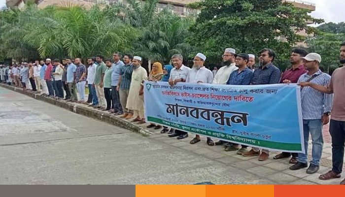 মানববন্ধনে শিক্ষক সমিতির সভাপতি প্রফেসর ড. সাহিদুল ইসলাম বলেন, ২০০৩ সালে বাংলাদেশের চারটি ইউনিভার্সিটির বিআইটি থেকে ইউনিভার্সিটিতে কনভার্ট হয়। ভিসি ছাড়া যে কোন কিছু চলে না এর প্রথম ভুক্তভোগী হয় রুয়েট। ভিসি ছাড়া ঐ বিশ্ববিদ্যালয়টি প্রায় দুই মাসের অধিক সময় অচল অবস্থায় ছিল। বেতন ভাতাদি থেকে শুরু করে কোন ধরনের প্রশাসনিক কাজ হয়নি। ঢাকা, চট্টগ্রাম, রাজশাহী, জগন্নাথ এই চারটি ইউনিভার্সিটি ‘৭৩ সালের এ্যাক্ট অনুযায়ী চলে। ‘৭৩ ‘র এ্যাক্টে ওই বিশ্ববিদ্যালয়েরগুলোর একাডেমিক এবং প্রশাসনিক স্বায়ত্তশাসন রয়েছে। কিন্তু এর পরবর্তী কুয়েটসহ বাকি যে বিশ্ববিদ্যালয়গুলো সেগুলো ‘৭১ ‘রএ্যাক্ট অনুযায়ী চলে। ‘৭১’র এ্যাক্ট অনুযায়ী বিশ্ববিদ্যালয়গুলোর একাডেমিক স্বায়ত্তশাসন আছে, কিন্তু প্রশাসনিক স্বায়ত্তশাসন নেই। বিশ্ববিদ্যালয়ের এই নিয়ম অনুযায়ী আমাদের একটা বাসা বরাদ্দ কিংবা বাসায় কাউকে উঠাতে ভিসি’র স্বাক্ষর ছাড়া সম্ভব নয়। এই জন্য আমাদের দ্রুত ভিসি দরকার।