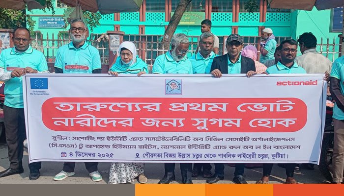 তারুণ্যের প্রথম ভোট নারীদের জন্য সুগম হোক স্লোগানকে সামনে রেখে কুষ্টিয়ায় মানববন্ধন অনুষ্ঠিত হয়েছে। বৃহস্প‌তিবার(৪ ডি‌সেম্বর) সকাল দশটায় শহরের এনএস রোডের পাবলিক লাইব্রেরি চত্বরে এ মানববন্ধনের আয়োজন করে মুক্তি নারী ও শিশু উন্নয়ন সংস্থা এবং সুশিল প্রজেক্ট হাব কুষ্টিয়া জেলা শাখা। সহযোগিতা করে অ্যাকশনএইড বাংলাদেশ।