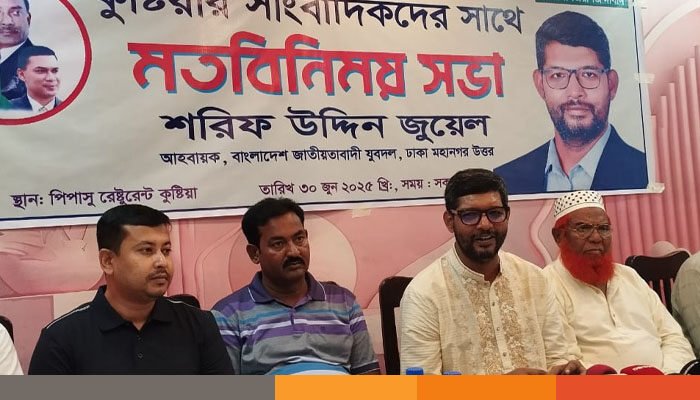 তিনি বলেন, আমরা বিশ্বাস করি দ্রুততম সময়ের মধ্যে বাংলাদেশে জাতীয় নির্বাচন অনুষ্ঠিত হবে। যে নির্বাচনের জন্য গত ১৭ বছর ধরে আমরা আন্দোলন করে আসছি। আজ সোমবার বেলা সাড়ে ১০টায় কুষ্টিয়া শহরের একটি রেষ্টুরেন্টে সাংবাদিকদের সাথে মতবিনিময় সভায় তিনি এসব কথা বলেন। মহানগর উত্তর যুবদল আহবায়ক শরিফ উদ্দিন জুয়েল বলেন,দৌলতপুরের ছেলে হিসেবে আমি এখন দৌলতপুরে রাজনৈতিক কর্মকান্ড পরিচালনা করছি। প্রতিটি নেতাকর্মীর খোঁজ খবর রাখছি। ফ্যাসিষ্ট শেখ হাসিনা পতনের আন্দোলনের অংশ হতে পেরে গর্বিত জানিয়ে তিনি বলেন,গত ১৭ বছরে রাজপথের আন্দোলন সংগ্রামে নেতৃত্ব দিতে গিয়ে তিনশো’র অধিক মামলার আসামী হয়েছি। ২৮টি গুলি বিদ্ধ শরীর নিয়েও সরকার পতনের আন্দোলন চালিয়ে গেছি। যুবদলের এই নেতা আরও বলেন,আমার রাজনীতির বয়স ৩১ বছর। এই ৩১ বছরের মধ্যে ৩১ মিনিটও আমার রাজনীতিতে গ্যাপ নেই।
