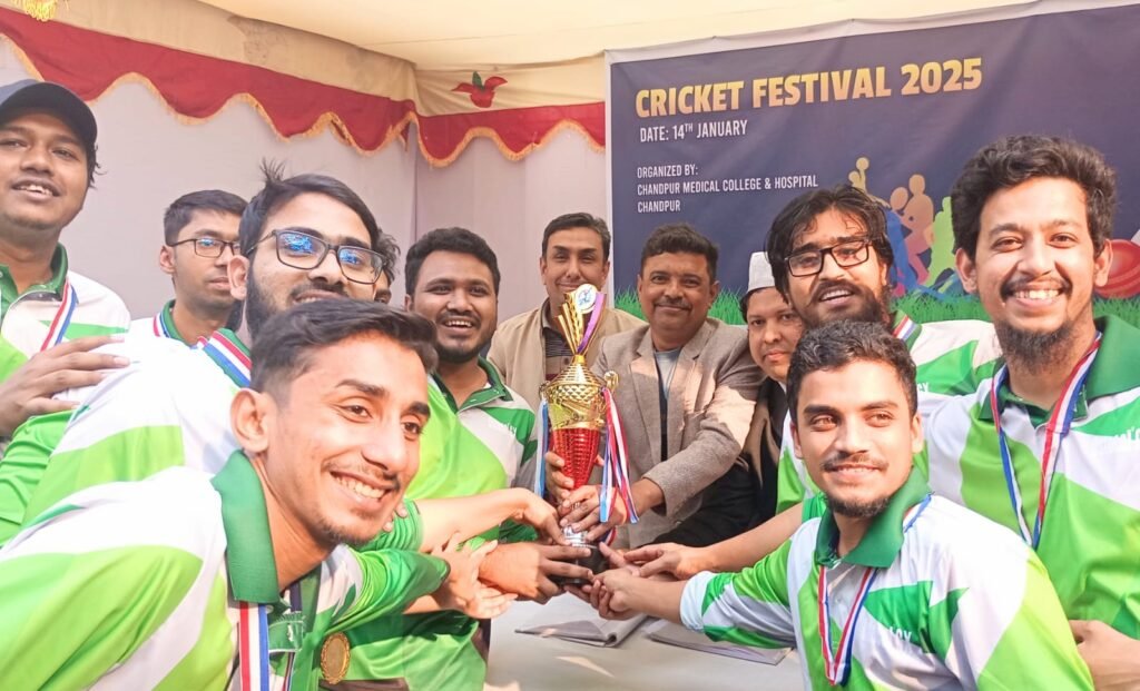দলের পক্ষে সর্বোচ্চ ৪০ রান করেন ডাঃ আওলাদুজ্জামন সৌরভ। এই রানের জবাবে চাঁদপুর সরকারি হাসপাতাল ও মেডিকেল কলেজ ইন্টার্নি চিকিৎসক দল ব্যাট করতে নেমে ৯.১ ওভারে ৩ উইকেটে ৭৫ রান করে ৭ উইকেটে জয়ী হয়। জয়ী দলের ডাঃ তাসনিমুল হাসান ৩৪ করেন। এছাড়াও হাসপাতাল চিকিৎসক দলের ডাঃ আসিব ২ উইকেট লাভ করেন।