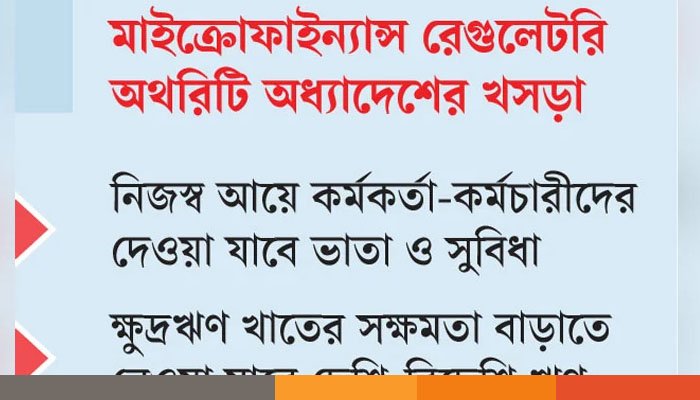 বাংলাদেশ মাইক্রোফাইন্যান্স রেগুলেটরি অথরিটি অধ্যাদেশের খসড়ায় এসব বিষয় তুলে ধরা হয়েছে। মূলত মাইক্রোক্রেডিট রেগুলেটরি অথরিটি আইন, ২০০৬ সংশোধন করে নতুন এই অধ্যাদেশটি চূড়ান্ত করার প্রস্তুতি চলছে। অধ্যাদেশের খসড়াটির বিষয়ে ইতোমধ্যে অংশীজনের মতামত চাওয়া হয়েছে।