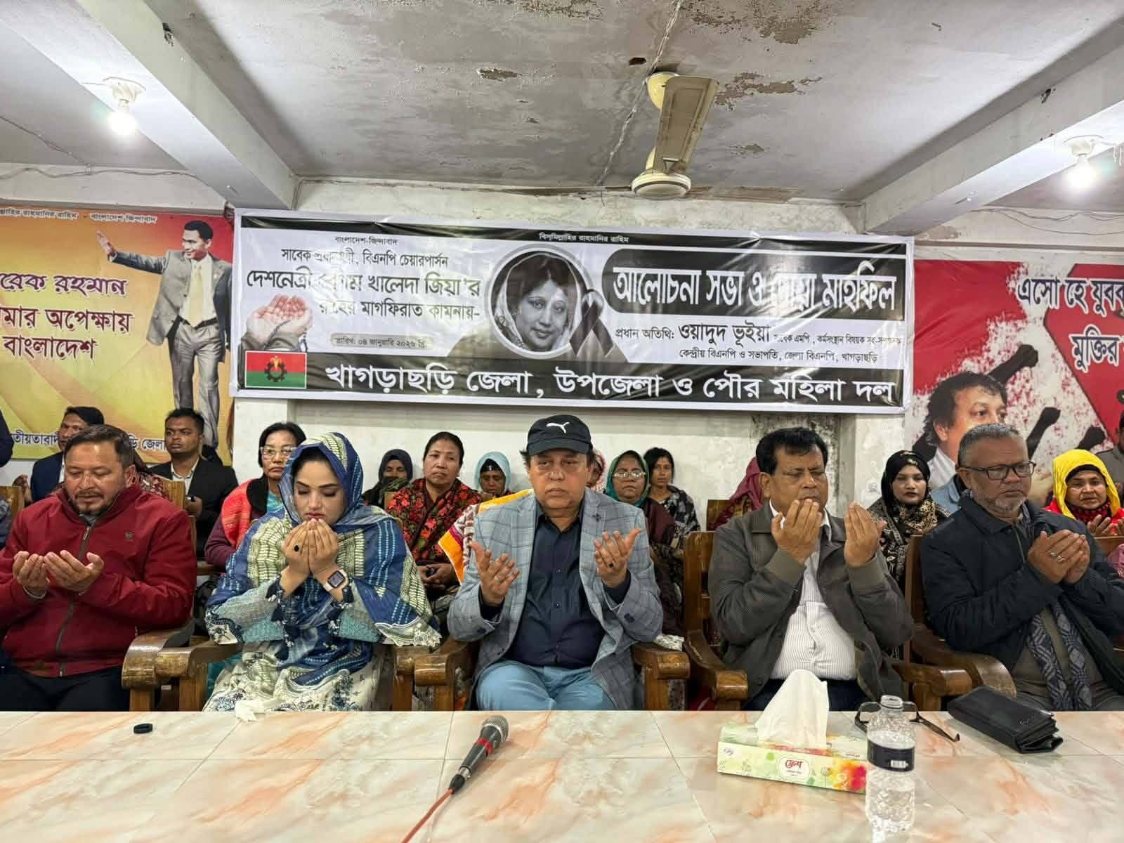 সাবেক প্রধানমন্ত্রী ও বিএনপি চেয়ারপার্সন বেগম খালেদা জিয়া-এর রুহের মাগফিরাত কামনায় খাগড়াছড়ি জেলা মহিলা দলের উদ্যোগে এক আলোচনা সভা ও দোয়া মাহফিল অনুষ্ঠিত হয়েছে।
