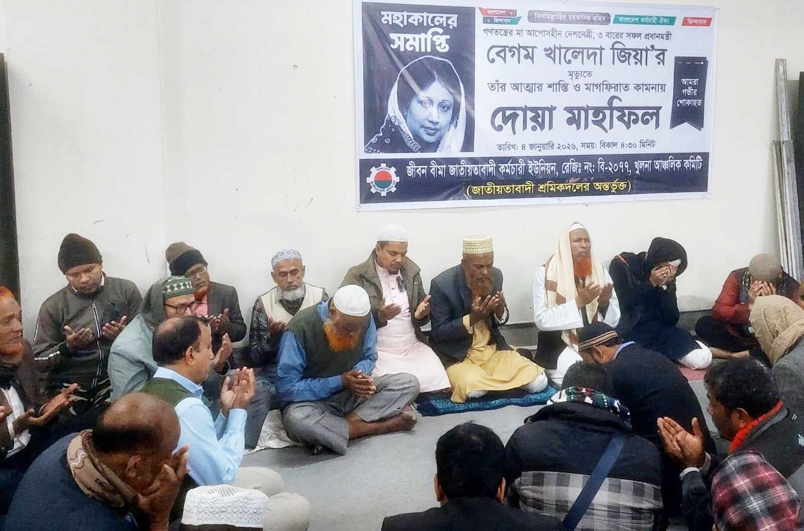 বিএনপির চেয়ারপারসন ও সাবেক প্রধানমন্ত্রী খালেদা জিয়ার বিদেহী আত্মার মাগফিরাত কামনায় দোয়া মাহফিলের আয়োজন করেছে জীবন বীমা জাতীয়তাবাদী কর্মচারী ইউনিয়নের খুলনা আঞ্চলিক কমিটি। রোববার (৪ জানুয়ারি) বাদ আছর কেডিএ এভিনিউস্থ জীবন বীমা ভবনে এ দোয়া মাহফিলের আয়োজন করা হয়।