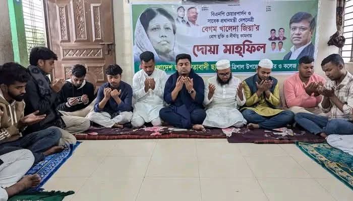 বিএনপির চেয়ারপার্সন সাবেক প্রধানমন্ত্রী বেগম খালেদা জিয়া’র আশু রোগমুক্তি ও দীর্ঘায়ু কামনায় ত্রিশাল উপজেলা, পৌর ও কলেজ শাখা ছাত্রদলের উদ্যোগে “দোয়া ও মিলাদ মাহফিল” মঙ্গলবার দলীয় কার্যালয়ে অনুষ্ঠিত হয়েছে।