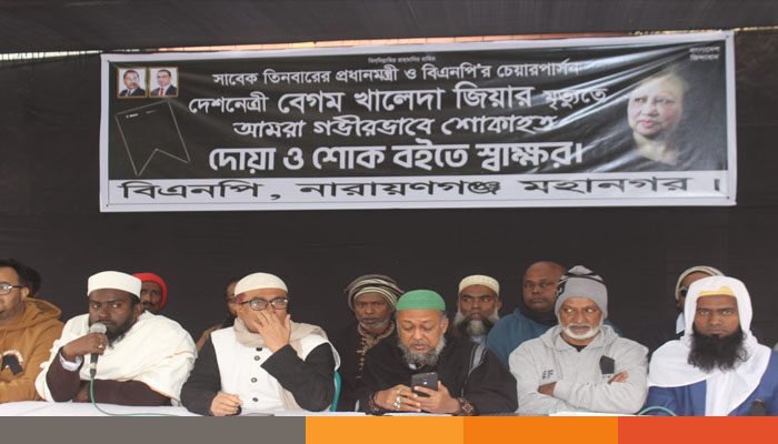 সাবেক প্রধানমন্ত্রী ও বিএনপির চেয়ারপারসন বেগম খালেদা জিয়ার আত্মার মাগফিরাত কামনায় নারায়ণগঞ্জ মহানগর বিএনপি ও জেলা আইনজীবী সমিতির উদ্যোগে মসজিদে দোয়া, কোরআন খতম ও শোক বইতে স্বাক্ষর কর্মসূচি পালন করা হয়েছে।