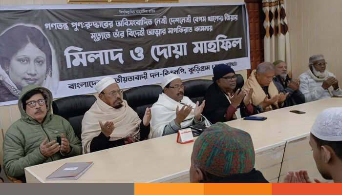 বাংলাদেশের গণতান্ত্রিক রাজনীতির এক অবিসংবাদিত নেতা, আপসহীন সংগ্রামের প্রতীক, দেশনেত্রী ও সাবেক প্রধানমন্ত্রী বেগম খালেদা জিয়ার মৃত্যুতে শোকের ছায়া নেমে এসেছে কুড়িগ্রাম জুড়ে। তাঁর ইন্তেকালে গভীর বেদনা ও অশ্রুভেজা হৃদয়ে কুড়িগ্রাম জেলা বিএনপির উদ্যোগে কোরআন খতম ও দোয়া মাহফিল অনুষ্ঠিত হয়েছে।