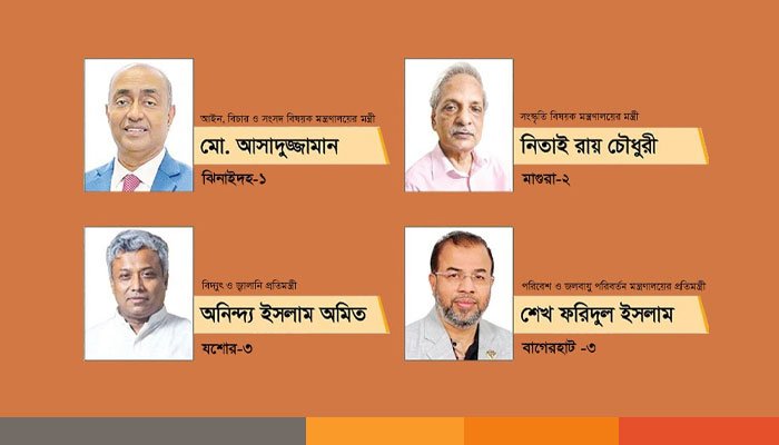 খুলনা বিভাগের চার জন হলেন, নিতাই রায় চৌধুরী (সংস্কৃতি বিষয়ক মন্ত্রণালয়ের মন্ত্রী) ও মো. আসাদুজ্জামান (আইন, বিচার ও সংসদ বিষয়ক মন্ত্রণালয়ের মন্ত্রী) এবং অনিন্দ্য ইসলাম অমিত (বিদ্যুৎ ও জ্বালানি প্রতিমন্ত্রী) ও শেখ ফরিদুল ইসলাম (পরিবেশ ও বন প্রতিমন্ত্রী)।
