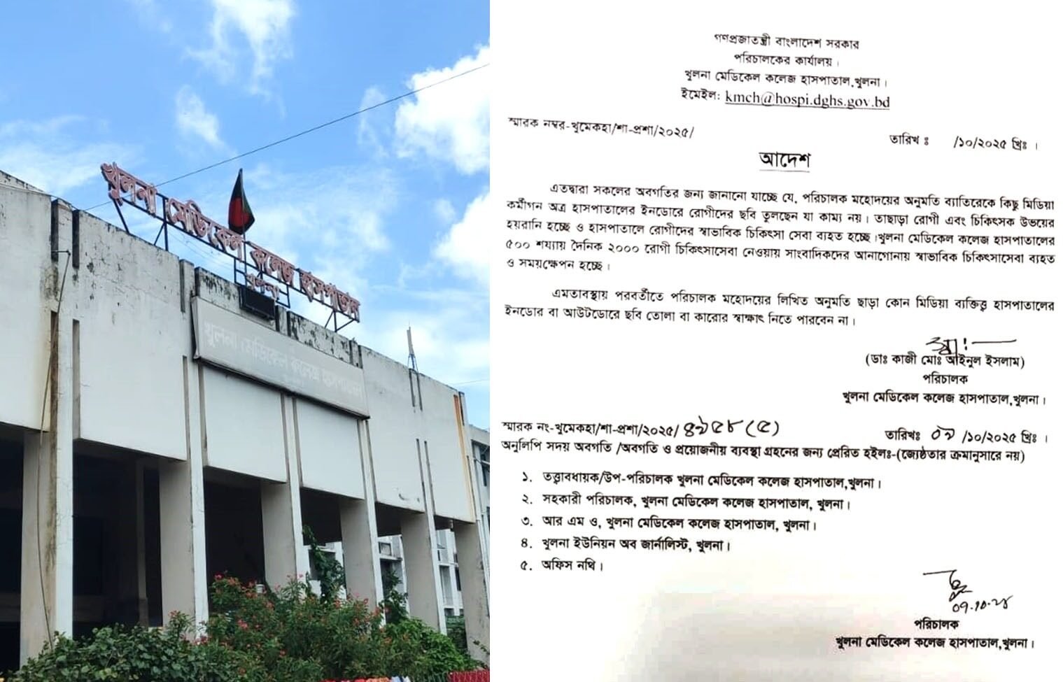 অফিস আদেশে আরও উল্লেখ করা হয়, “পরিচালকের লিখিত অনুমতি ছাড়া কোনো মিডিয়া ব্যক্তি হাসপাতালের ইনডোর বা আউটডোরে ছবি তুলতে বা সাক্ষাৎকার নিতে পারবেন না।”