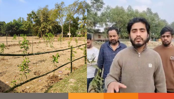অভিযোগ সূত্রে জানা যায়, স্থানীয় দেওগা গ্রামের ছোট মিয়া দেওগাঁও, রেজু মিয়া ও গেদু মিয়া তাদের সহযোগীদের নিয়ে রাতের অন্ধকারে ফলন্ত আম ও কাঠের চারা গাছ কেটে ফেলে এ সময় তারা জমিটির মালিকানা নিজেদের দাবি করে এবং বাধা দিলে প্রাণনাশের হুমকি দেয়।