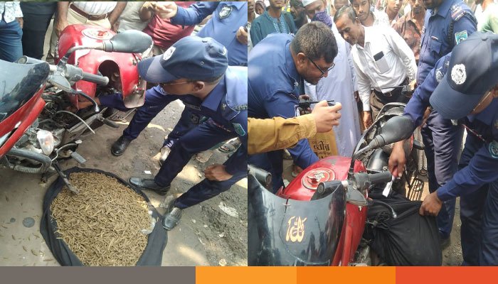 এতে মোটরসাইকেল আরোহী গাড়িটি রেখে দ্রুত পালিয়ে যান। পরে পুলিশ মোটরসাইকেলটি জব্দ করে তল্লাশি চালায়। তল্লাশিতে মোটরসাইকেলের সিটের নিচে এবং জ্বালানি ট্যাংকের ভেতরে বিশেষভাবে লুকিয়ে রাখা বিপুল পরিমাণ গাঁজা উদ্ধার করা হয়।