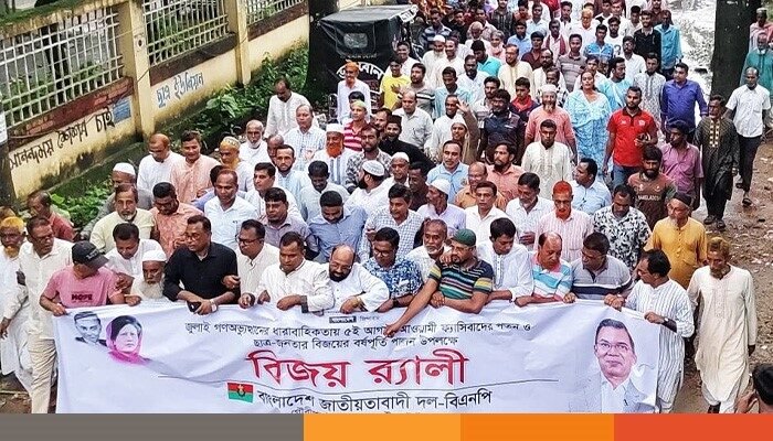জুলাই গণঅভ্যুত্থানে শোক ও বিজয়ের বর্ষপূর্তি উপলক্ষ্যে ময়মনসিংহের গৌরীপুরে বিএনপির বিজয় মিছিলে ছাত্র জনতার ঢল নেমেছে। এ সময় পতিত প্রধানমন্ত্রী শেখ হাসিনার বিচার দাবিতে শ্লোগান দেয় বিক্ষোভকারীরা।