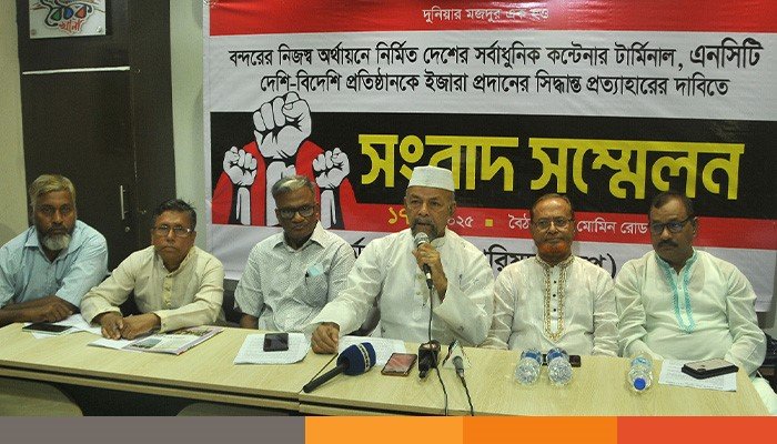 চট্টগ্রাম বন্দরের নিউমুরিং কনটেইনার টার্মিনাল (এনসিটি) ডিপি ওয়ার্ল্ড নামক বিদেশি কোম্পানিকে ইজারা দেওয়ার সিদ্ধান্ত এবং রাখাইনে তথাকথিত “মানবিক করিডোর” প্রতিষ্ঠার গুঞ্জনের বিরুদ্ধে শ্রমিক-কর্মচারী ঐক্য পরিষদ আজ এক জরুরি সংবাদ সম্মেলনের আয়োজন করে।