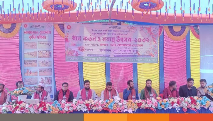 দ্বীপের দেশে কৃষক হাসে, আমনের ফসল বেশ, নতুন ধানের পিঠা-পুলি খুশির নেইকো শেষ এই স্লোগানকে সামনে রেখে ভোলার চরফ্যাশনে ধান কর্তন ও নবান্ন উৎসব-১৪৩২ উদযাপন করা হয়েছে।