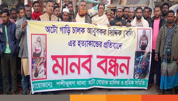 অটো চালককে হত্যা করে গাড়ি ছিনতাইয়ের ঘটনায় জড়িতদের গ্রেফতারের দাবিতে শশীভূষন থানা অটো মালিক ও চালকদের মানববন্ধন অনুষ্ঠিত হয়েছেশুক্রবার ২ জানুয়ারি বিকালে শশীভূষন বাজার সদর রোডে এ মানববন্ধন অনুষ্ঠিত হয়।