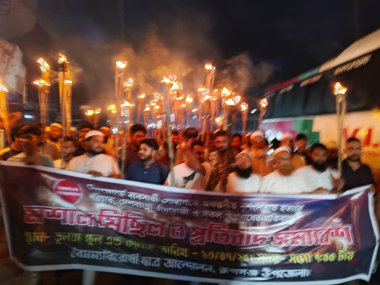 রোববার (১৩ জুলাই) রাতে রূপগঞ্জ উপজেলার ভুলতা ও গোলাকান্দেল এলাকার ঢাকা সিলেট মহাসড়কে এ মশাল মিছিল বের করেন তারা। মিছিলটি সড়কের প্রায় এক কিলোমিটার এলাকা জুড়ে পদক্ষিণ করে।