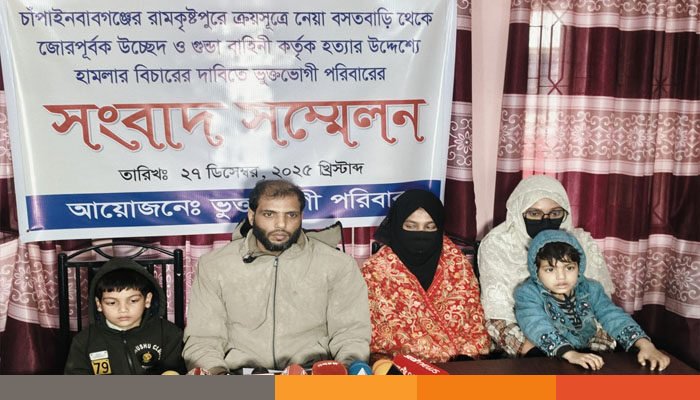 চাঁপাইনবাবগঞ্জের রামকৃষ্টপুর এলাকায় বসতবাড়ি থেকে একটি পরিবারকে উচ্ছেদ ও হামলার ঘটনায় দোষীদের বিচারের দাবিতে সংবাদ সম্মেলন অনুষ্ঠিত হয়েছে।